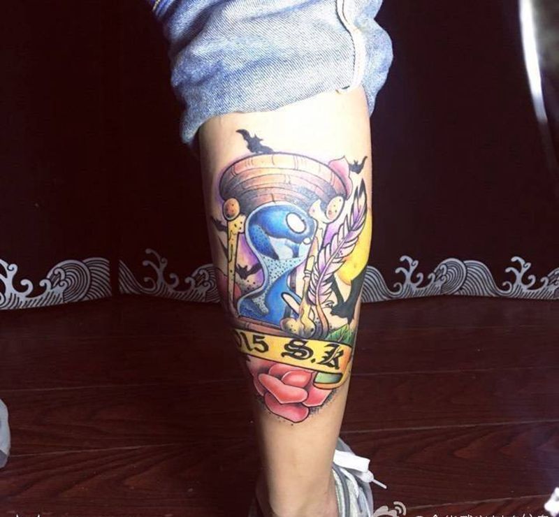 • T包小腿吹火男+阿多福纹身图片_腿部老传统新传统吹火男阿