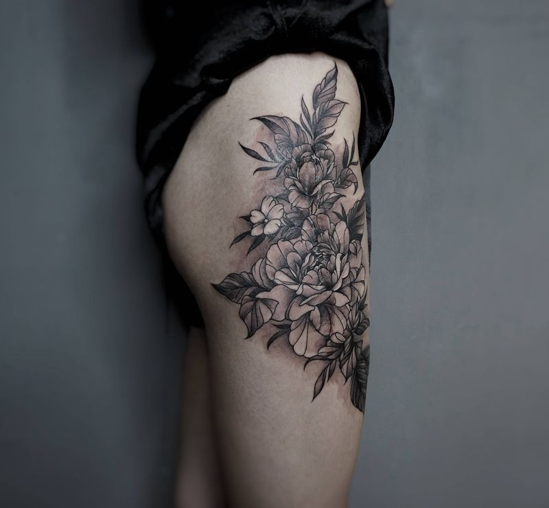 素花疤痕遮盖纹身图片_腿部纹身图案