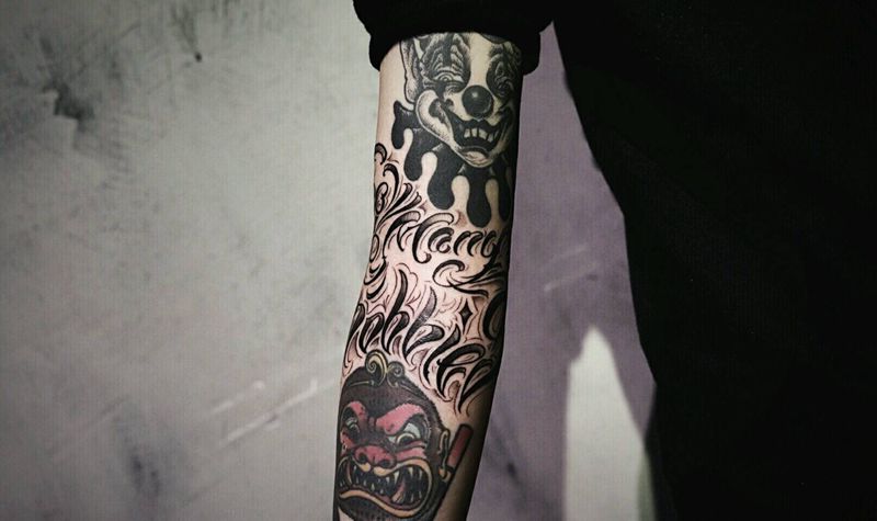 too many hobbie纹身图片_手臂欧美字符原创花体字奇卡诺花成品纹身图案