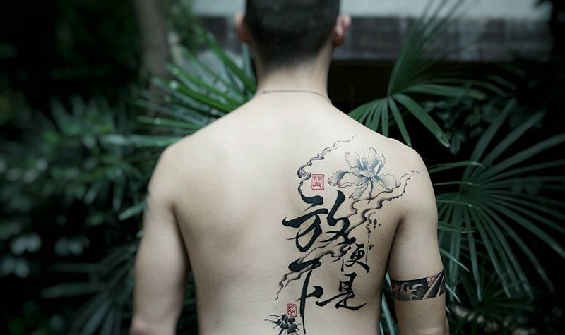 放下纹身图片_肩部背部传统国画字符宗教原创泼墨书法成品纹身图案