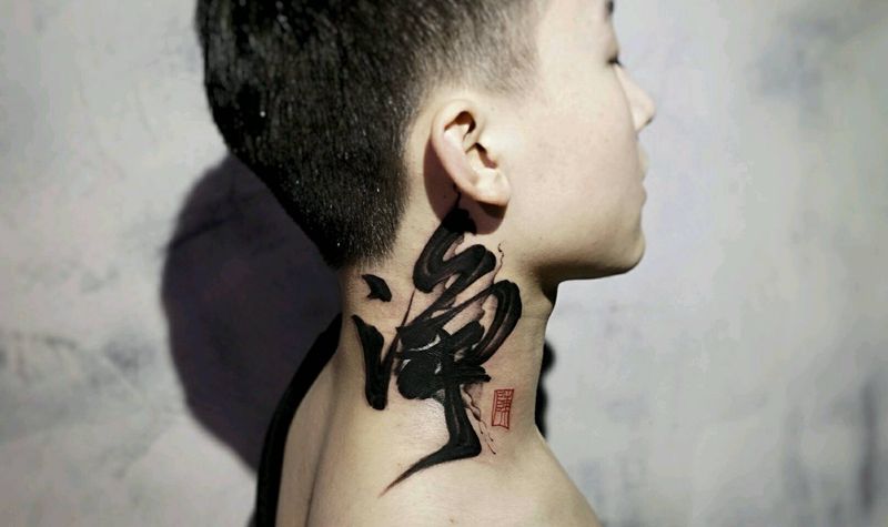 净纹身图片_颈部传统国画字符原创泼墨书法成品纹身图案