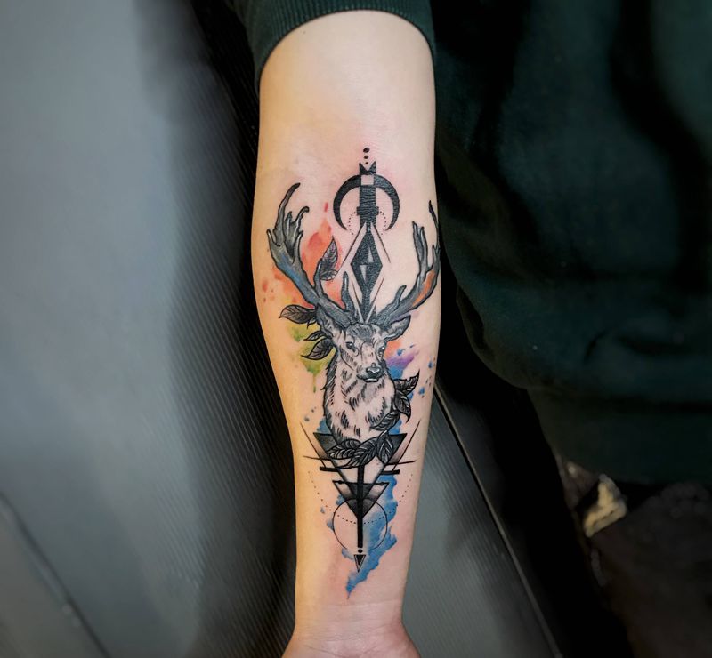 水彩鹿头修改纹身图片_手臂水彩几何纹身图案