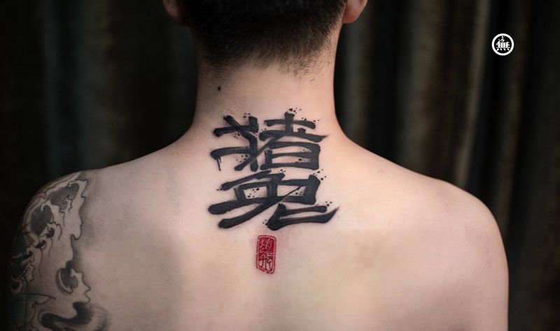 生肖猪兔纹身图片_背部颈部水墨书法纹身图案
