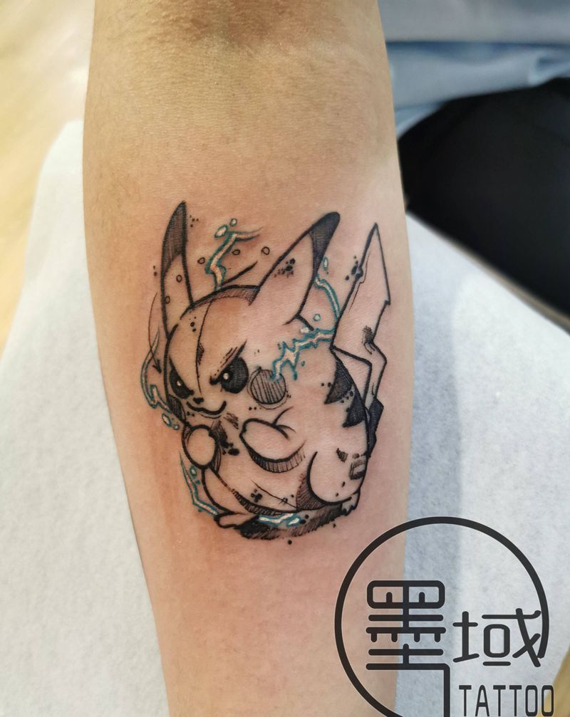 当前位置: 首页 >浙江省舟山市纹身店-墨域纹身工作室纹身图案>卡通速写比卡丘纹身图片_手臂几何纹身图案