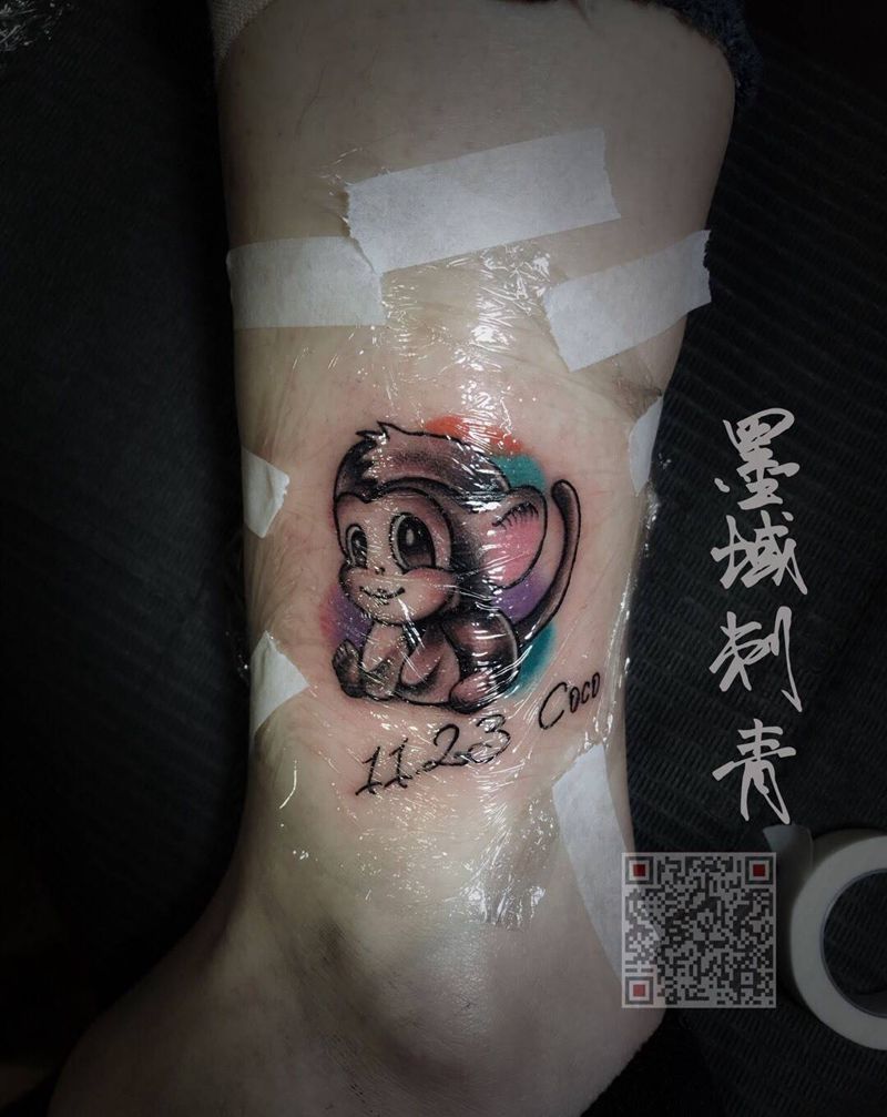 当前位置: 首页 >浙江省舟山市纹身店-墨域纹身工作室纹身图案>猴年宝贝纹身图片_成品腿部脚部写实清新动物纹身图案