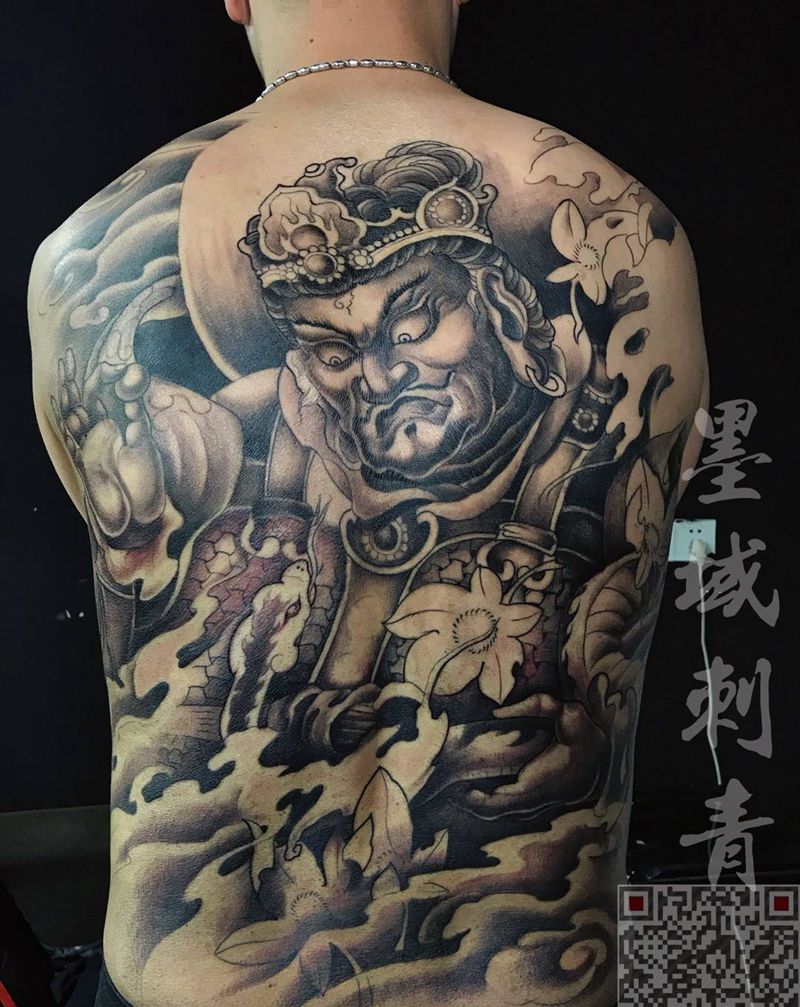 当前位置: 首页 >浙江省舟山市纹身店-墨域纹身工作室纹身图案>广目天王纹身图片_成品背部传统鬼神纹身图案