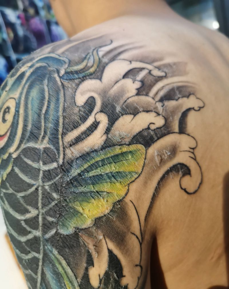 当前位置: 首页 >浙江省舟山市纹身店-墨域纹身工作室纹身图案>大臂传统鲤鱼纹身图片_新传统纹身图案
