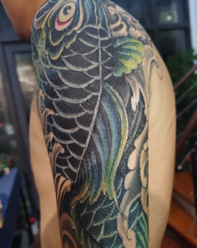 当前位置: 首页 >浙江省舟山市纹身店-墨域纹身工作室纹身图案>大臂传统鲤鱼纹身图片_新传统纹身图案