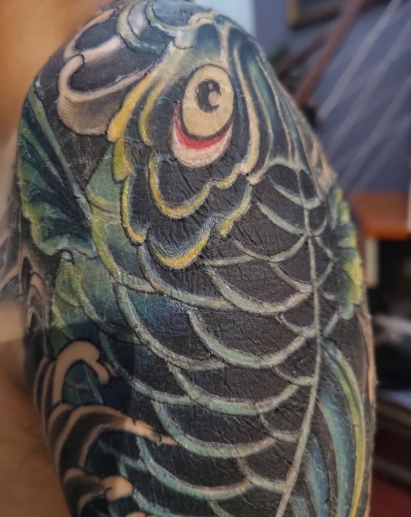 当前位置: 首页 >浙江省舟山市纹身店-墨域纹身工作室纹身图案>大臂传统鲤鱼纹身图片_新传统纹身图案