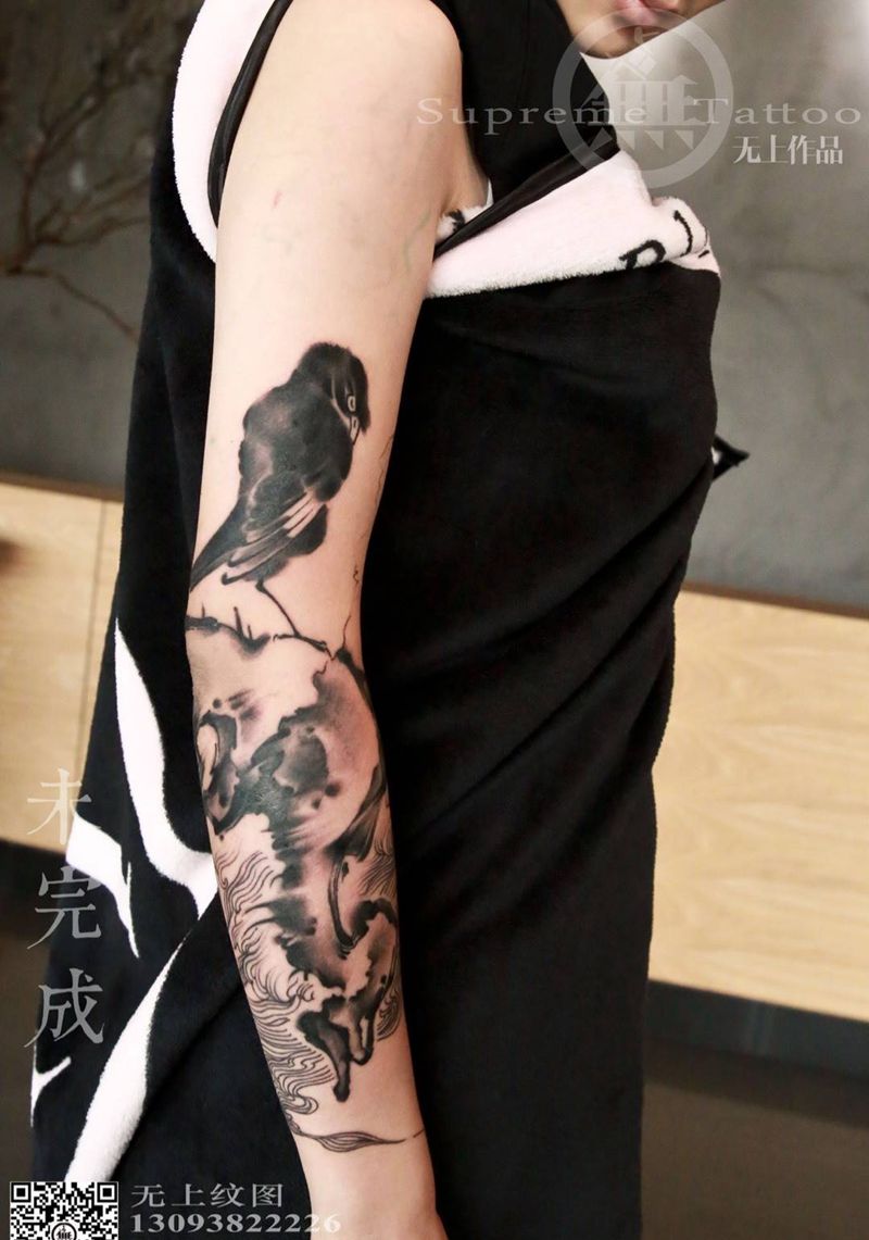 水墨风花臂纹身图片_成品手臂传统清新国画植物动物原创纹身图案