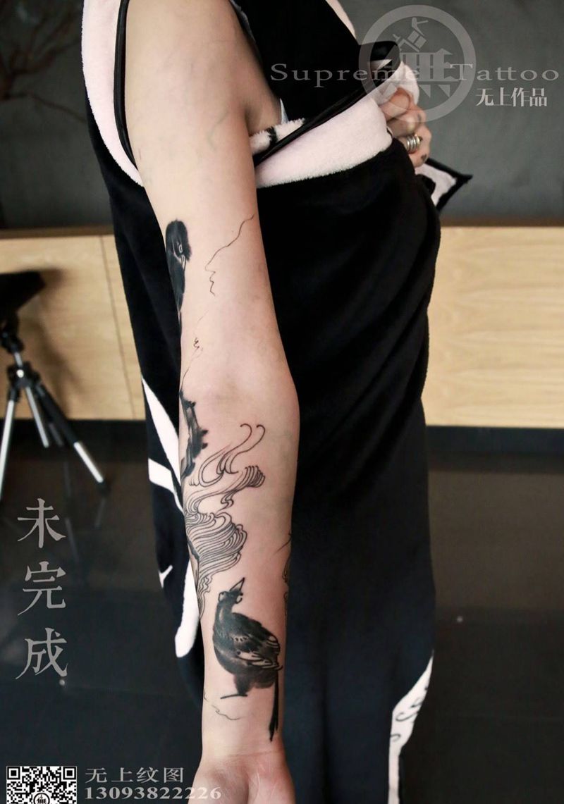 当前位置: 首页 >浙江省台州市纹身店-无上纹图纹身图案>水墨风花臂纹身图片_成品手臂传统清新国画植物动物原创纹身图案