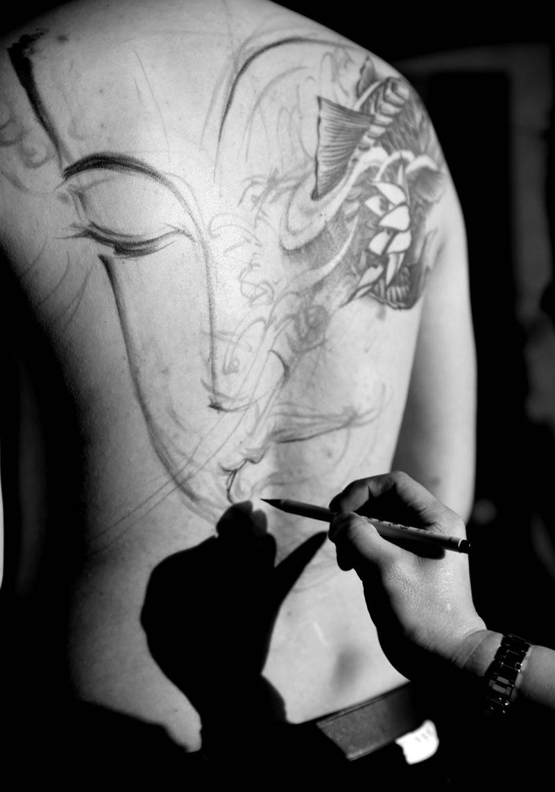 当前位置: 首页 >浙江省台州市纹身店-无上纹图纹身图案>印象风添加未完成纹身图片_成品背部传统国画清新肖像人物原创宗教纹身图案