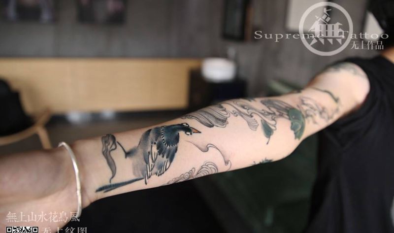 水墨花臂成品图纹身图片_成品手臂传统清新国画植物原创动物图腾无上纹图纹身图案
