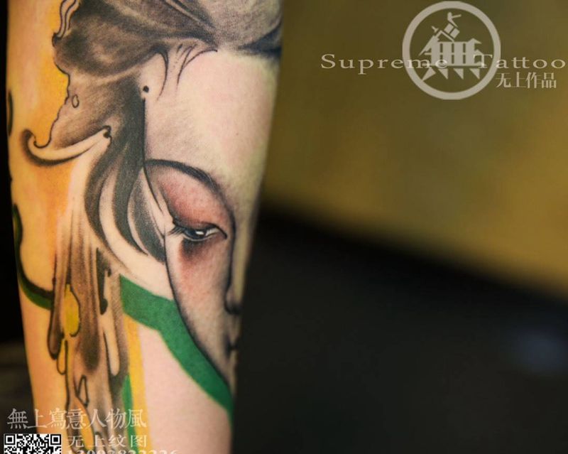 当前位置: 首页 >浙江省台州市纹身店-无上纹图纹身图案>印象风肖像添加纹身图片_成品手臂欧美肖像清新人物原创无上纹图生活纹身图案