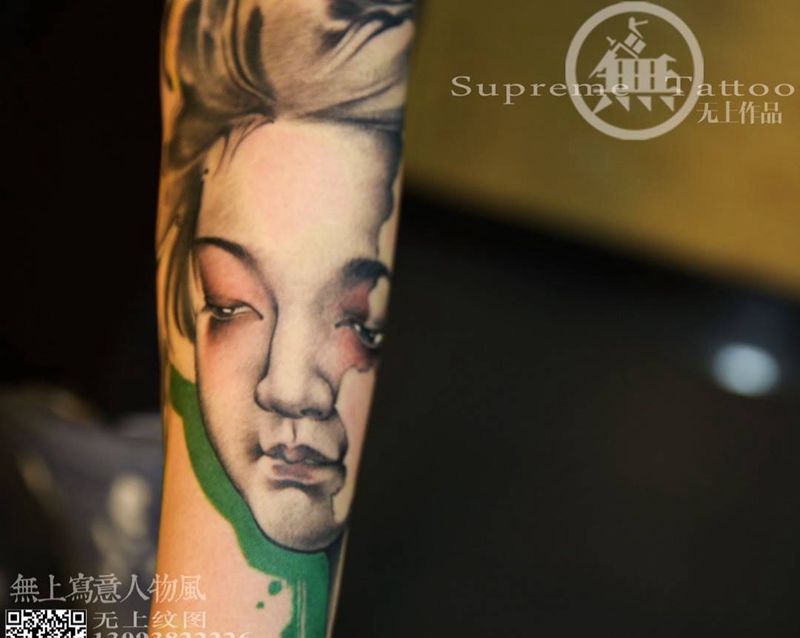 当前位置: 首页 >浙江省台州市纹身店-无上纹图纹身图案>印象风肖像添加纹身图片_成品手臂欧美肖像清新人物原创无上纹图生活纹身图案