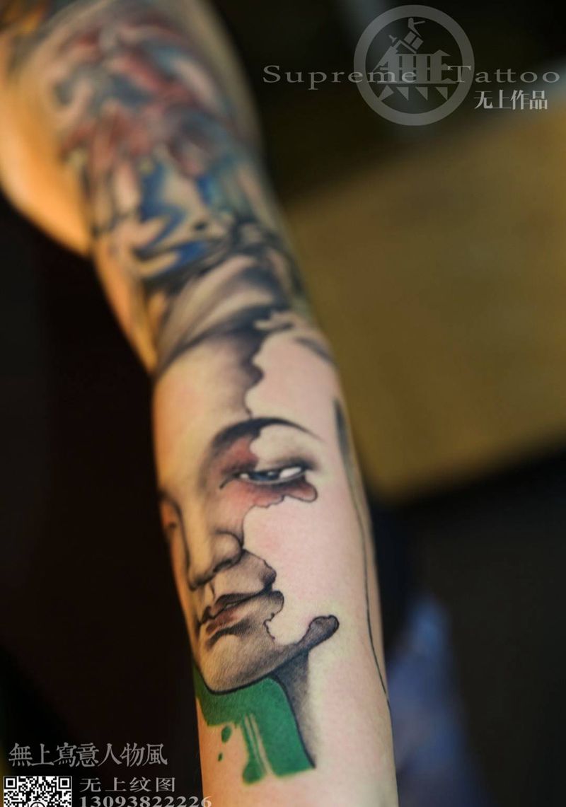 当前位置: 首页 >浙江省台州市纹身店-无上纹图纹身图案>印象风肖像添加纹身图片_成品手臂欧美肖像清新人物原创无上纹图生活纹身图案