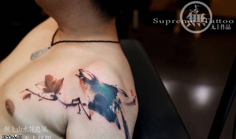 当前位置: 首页 >浙江省台州市纹身店-无上纹图纹身图案>肩部喜鹊纹身图片_成品肩部传统清新动物植物原创图腾无上纹图生活纹身图案