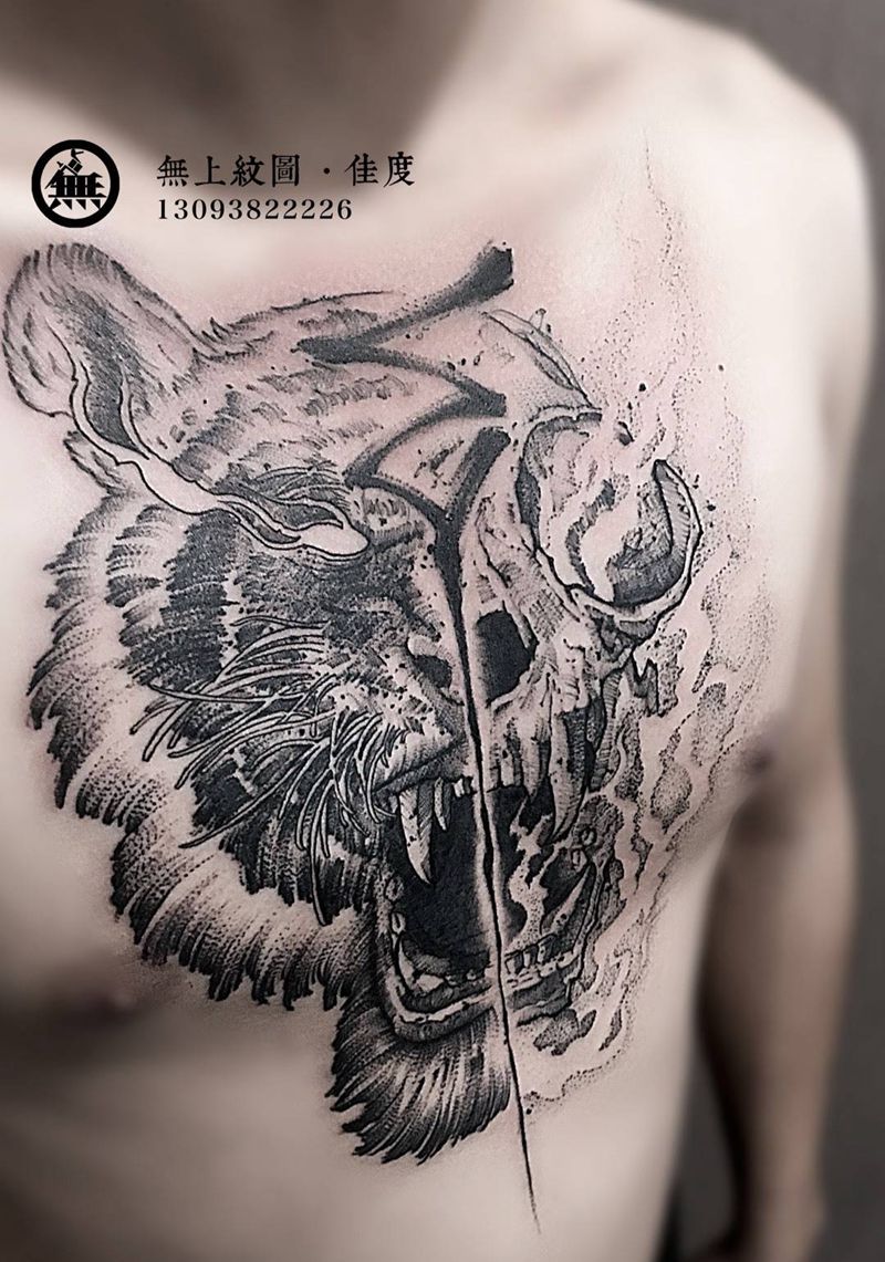 虎骨纹身图片_成品胸部欧美肖像动物静物图腾无上纹图招生手稿纹身图案