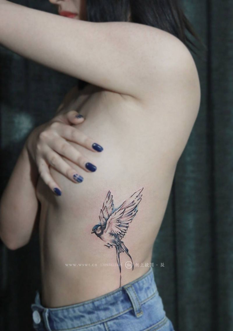 侧腰燕子纹身图片_成品腰部欧美清新动物图腾无上纹图培训手稿招生纹身图案