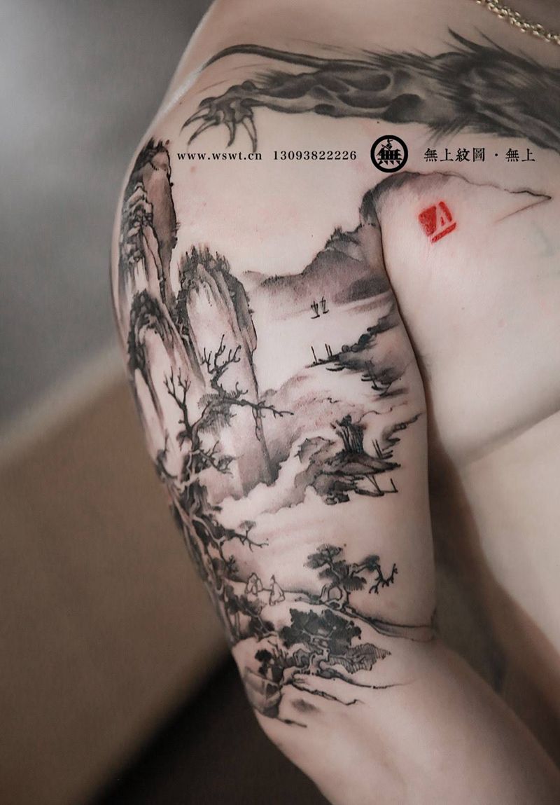 山水画纹身纹身图片_成品手臂传统肖像原创国画植物无上纹图招生纹身图案