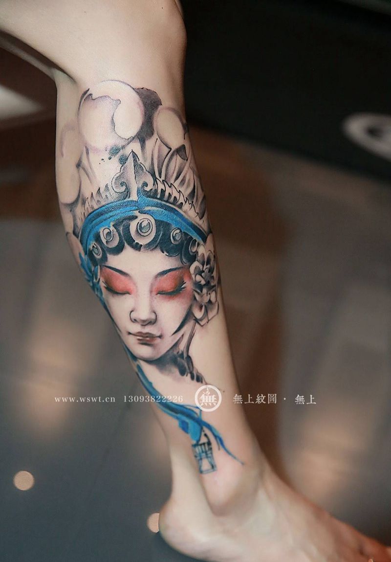 当前位置: 首页 >浙江省台州市纹身店-无上纹图纹身图案>花旦纹身纹身图片_成品腿部清新肖像人物原创无上纹图招生培训纹身图案