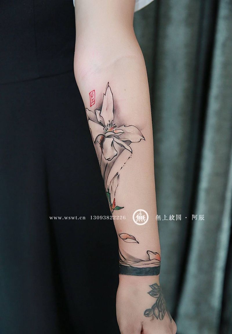 玉兰花遮盖旧纹身纹身图片_成品手臂传统清新植物原创无上纹图水墨培训招生纹身图案