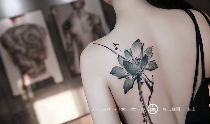 水墨莲花纹身图片_成品背部传统清新植物原创无上纹图水墨莲花培训纹身图案