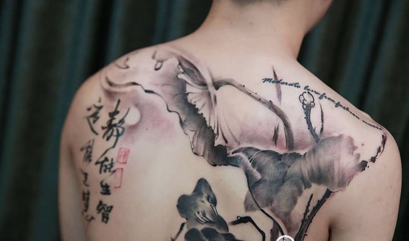 满背水墨山水纹身图片_成品背部清新传统植物字符无上纹图水墨招生培训纹身图案