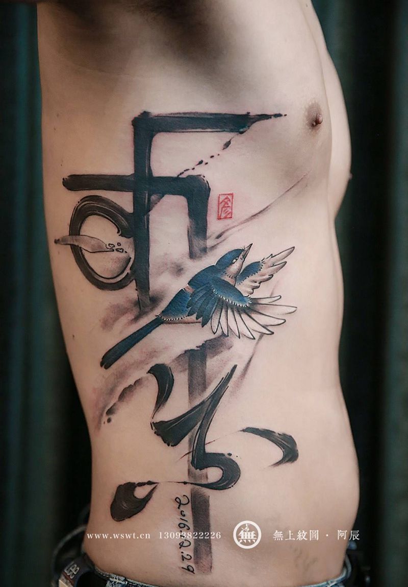 当前位置: 首页 >浙江省台州市纹身店-无上纹图纹身图案>侧腰书法纹身图片_成品腰部清新传统字符动物原创无上纹图水墨书法纹身图案