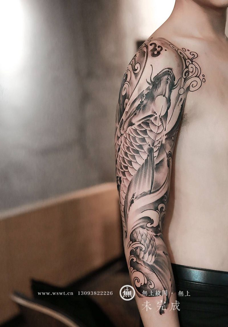 水墨鱼花臂纹身图片_成品手臂传统清新动物原创植物无上纹图水墨莲花纹身图案