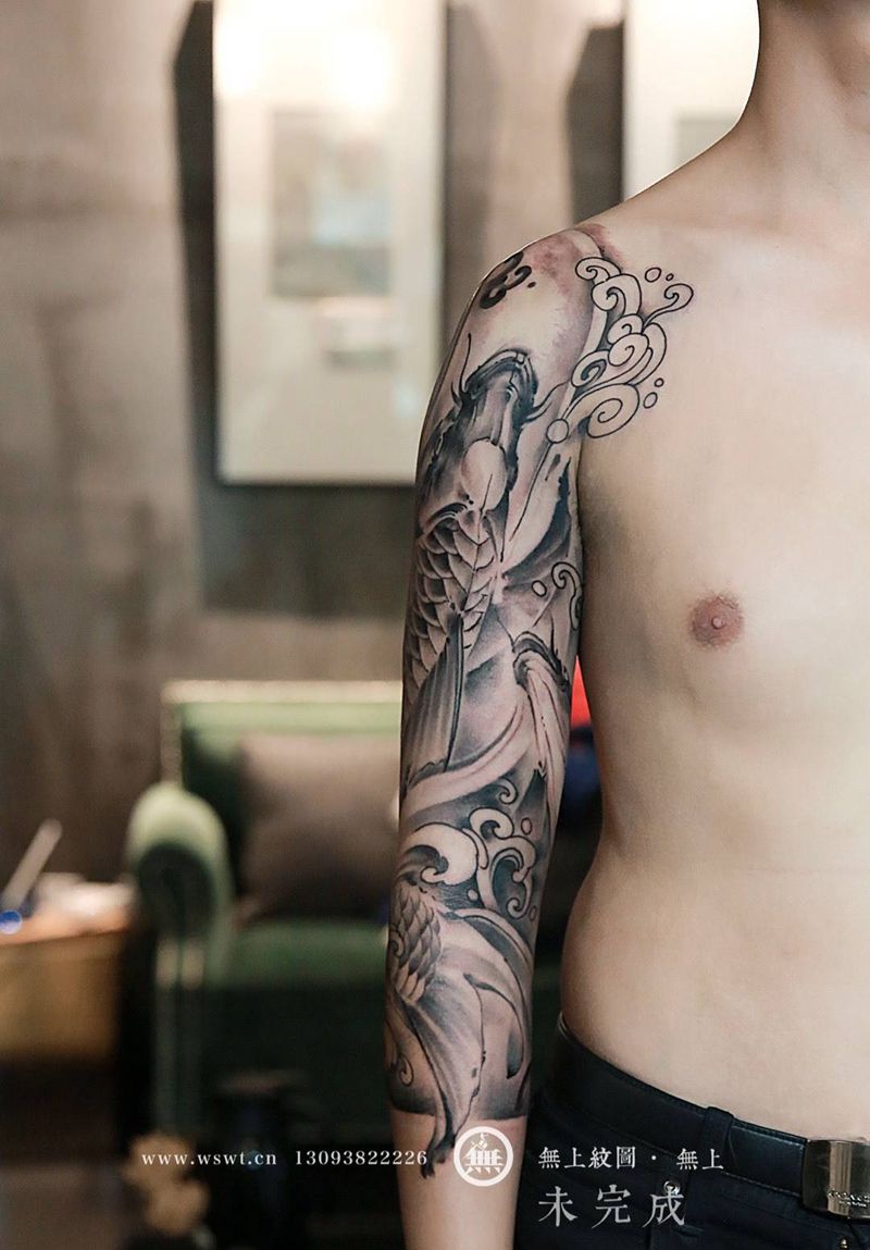 水墨鱼花臂纹身图片_成品手臂传统清新动物原创植物无上纹图水墨莲花纹身图案
