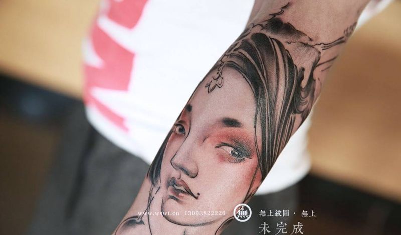 当前位置: 首页 >浙江省台州市纹身店-无上纹图纹身图案>仕女人物纹身图片_成品手臂传统人物清新原创无上纹图水墨招生纹身图案