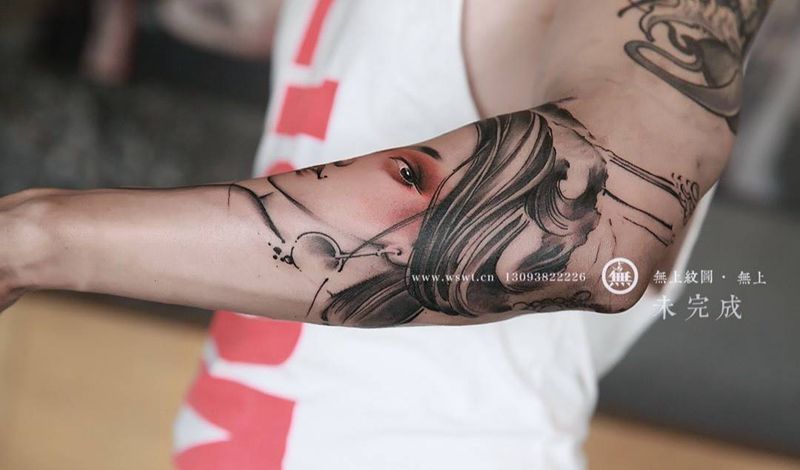 当前位置: 首页 >浙江省台州市纹身店-无上纹图纹身图案>仕女人物纹身图片_成品手臂传统人物清新原创无上纹图水墨招生纹身图案
