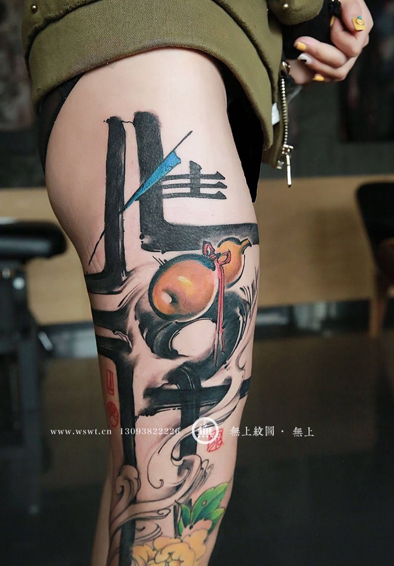 腿部书法纹身图片_成品腿部传统清新字符原创图腾无上纹图书法水墨纹身图案