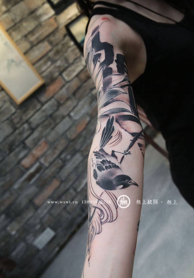 当前位置: 首页 >浙江省台州市纹身店-无上纹图纹身图案>水墨花臂纹身图片_成品手臂传统清新原创字符莲花水墨无上纹图书法纹身图案