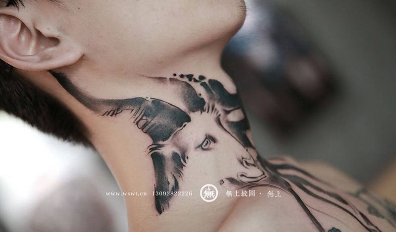 颈部书法纹身图片_成品颈部传统清新字符动物原创无上纹图水墨书法纹身图案