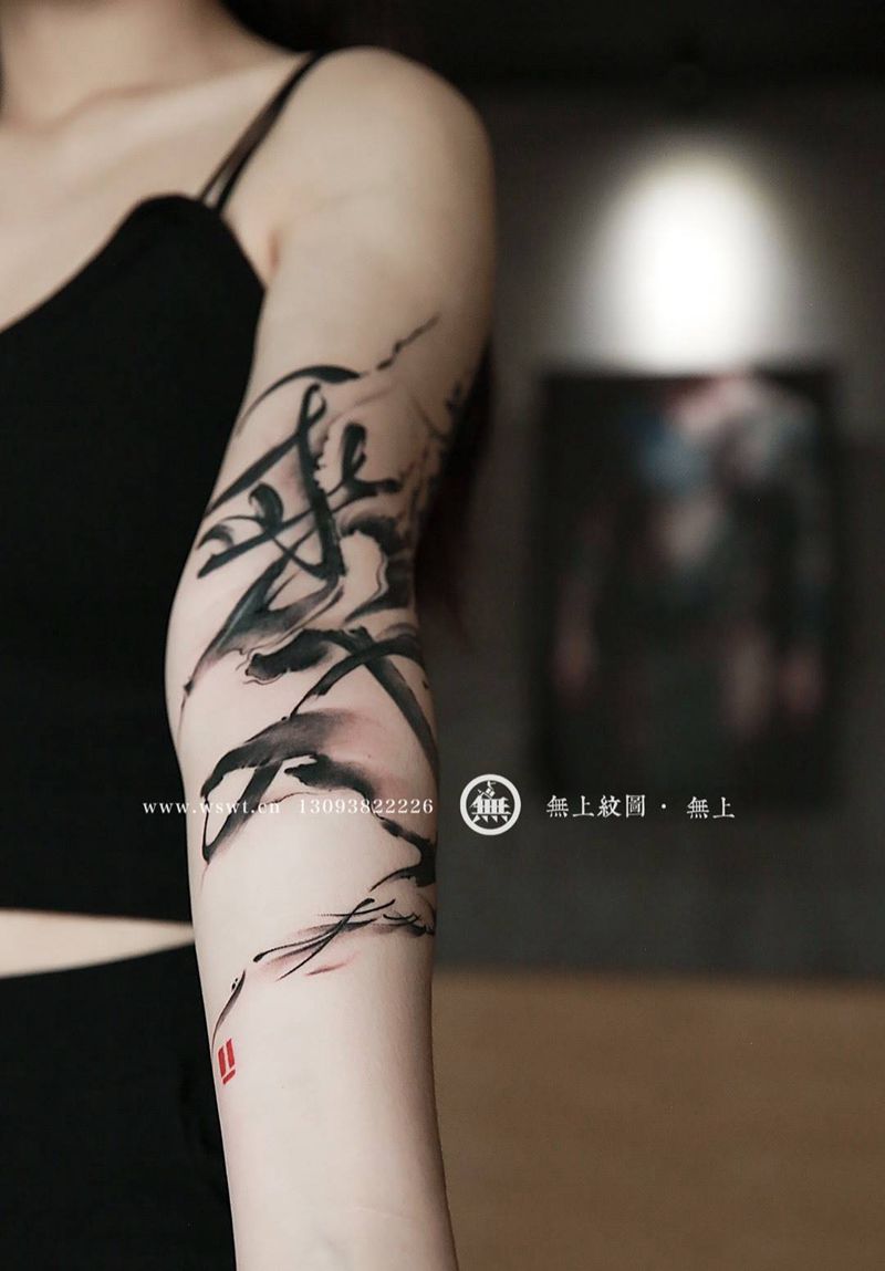 书法花臂纹身图片_成品手臂传统清新字符原创无上纹图书法水墨招生纹身图案