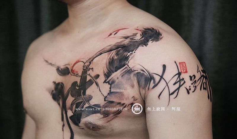 狭路相逢勇者胜纹身图片_成品胸部手臂传统清新原创字符人物无上纹图水墨纹身图案
