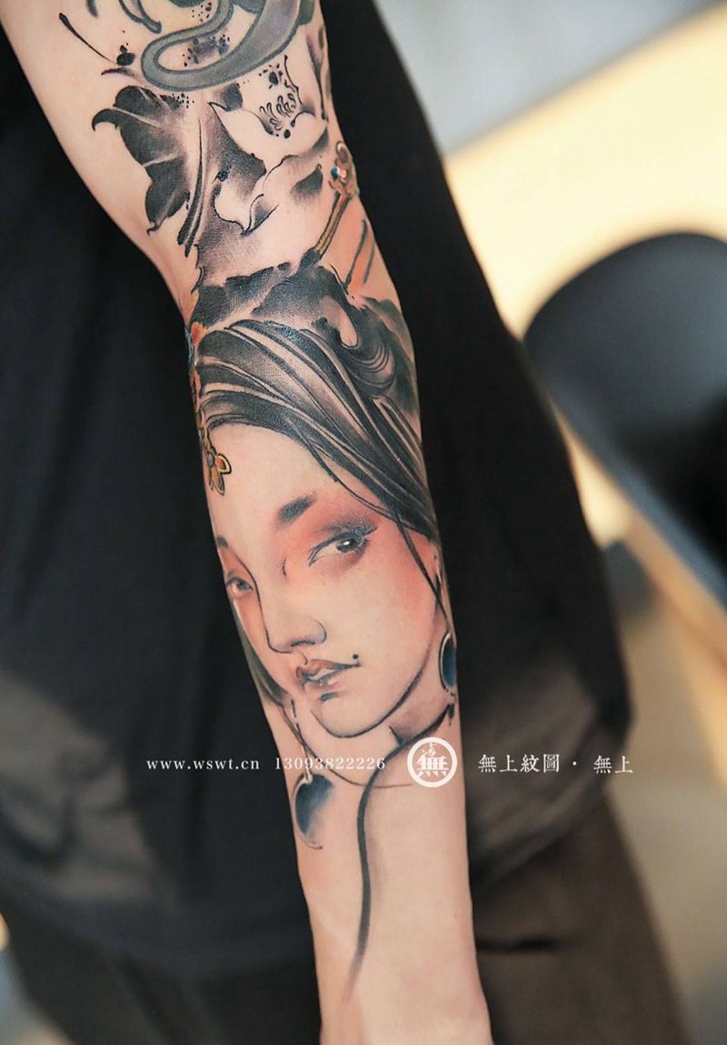 仕女人物纹身图片_成品手臂传统清新人物原创无上纹图水墨纹身图案