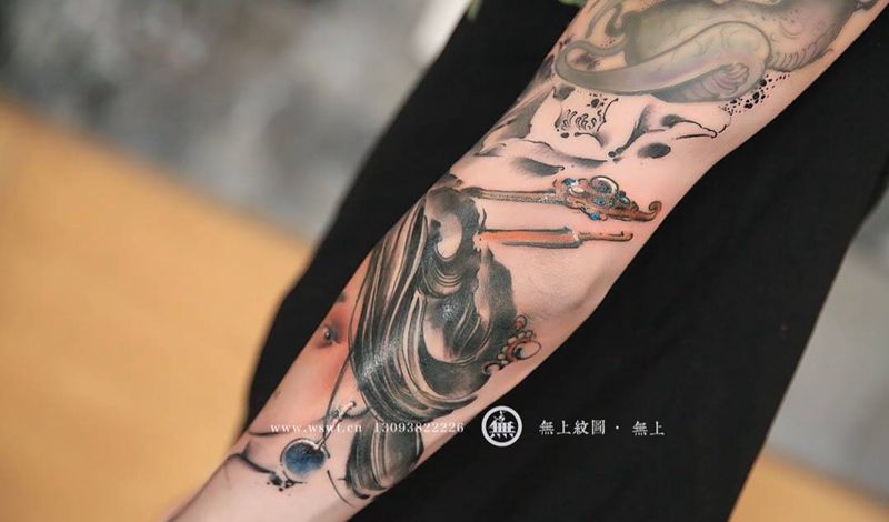 当前位置: 首页 >浙江省台州市纹身店-无上纹图纹身图案>仕女人物纹身图片_成品手臂传统清新人物原创无上纹图水墨纹身图案