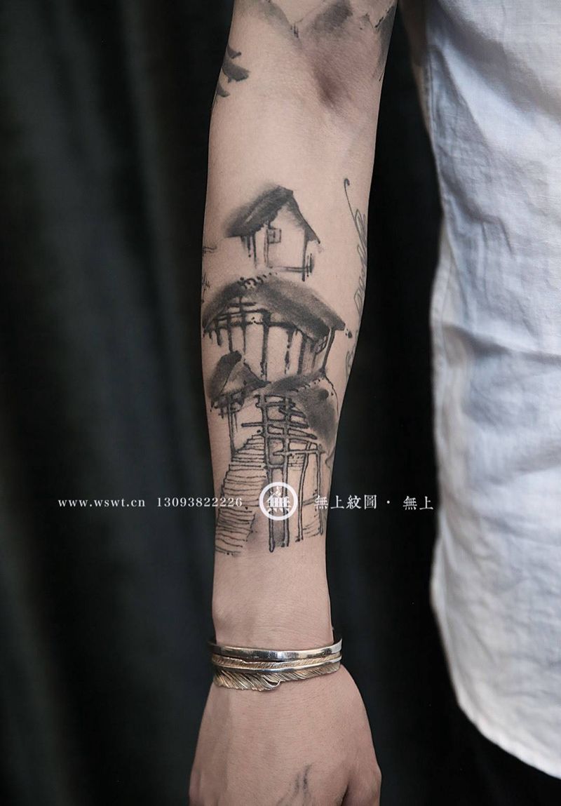当前位置: 首页 >浙江省台州市纹身店-无上纹图纹身图案>水墨纹身纹身图片_成品手臂传统清新原创静物无上纹图水墨招生纹身图案