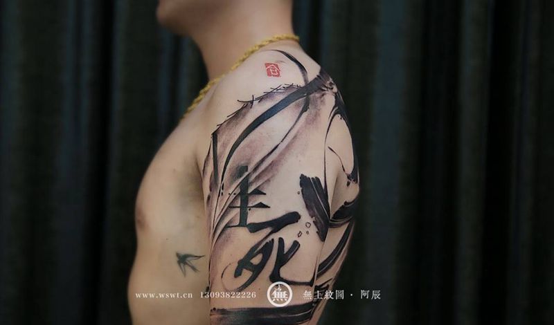 泼墨书法纹身纹身图片_成品肩部手臂胸部传统原创字符无上纹图水墨纹身图案
