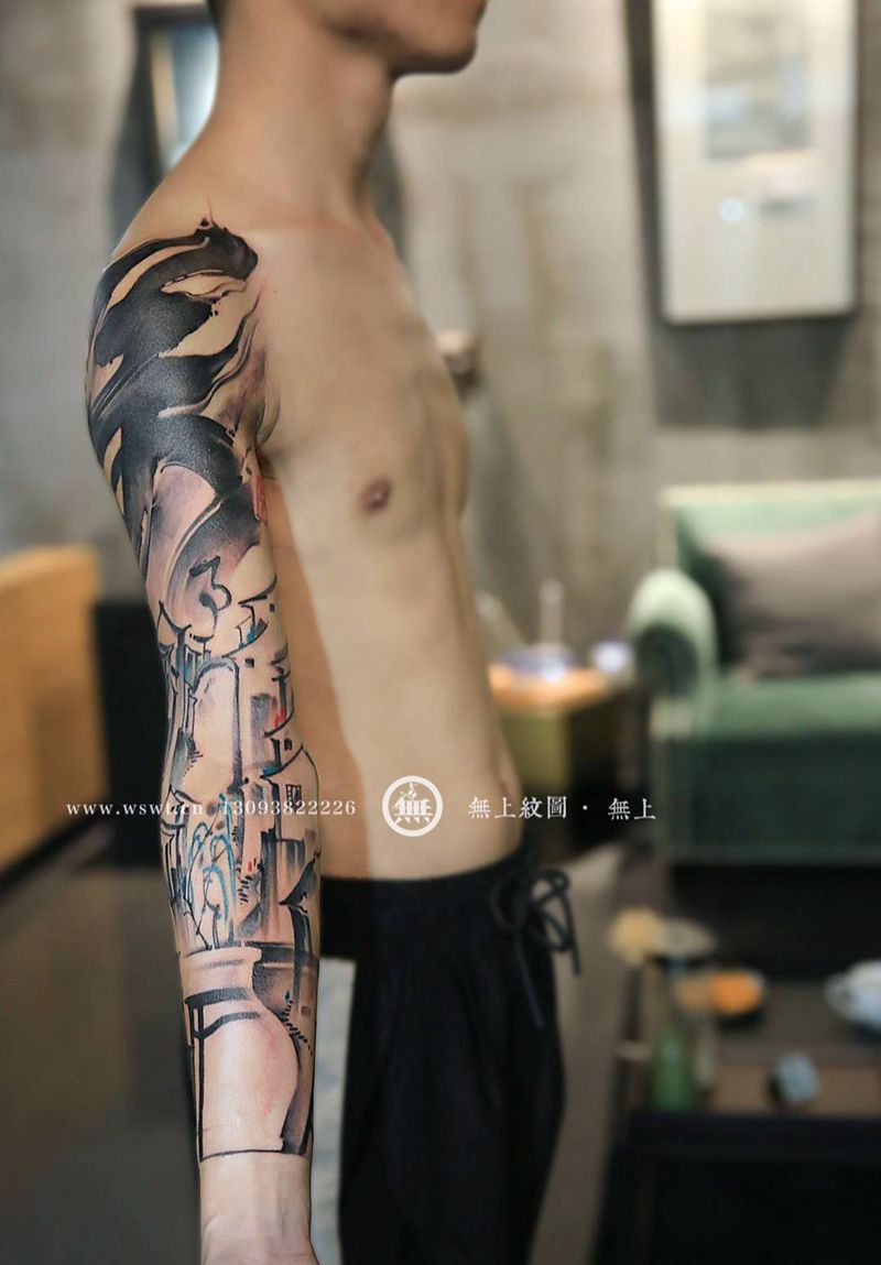 水墨花臂纹身图片_成品手部手臂传统字符静物原创无上纹图水墨纹身图案