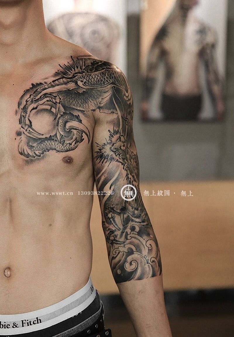 水墨龙纹身纹身图片_成品手臂胸部清新传统原创动物无上纹图水墨纹身图案