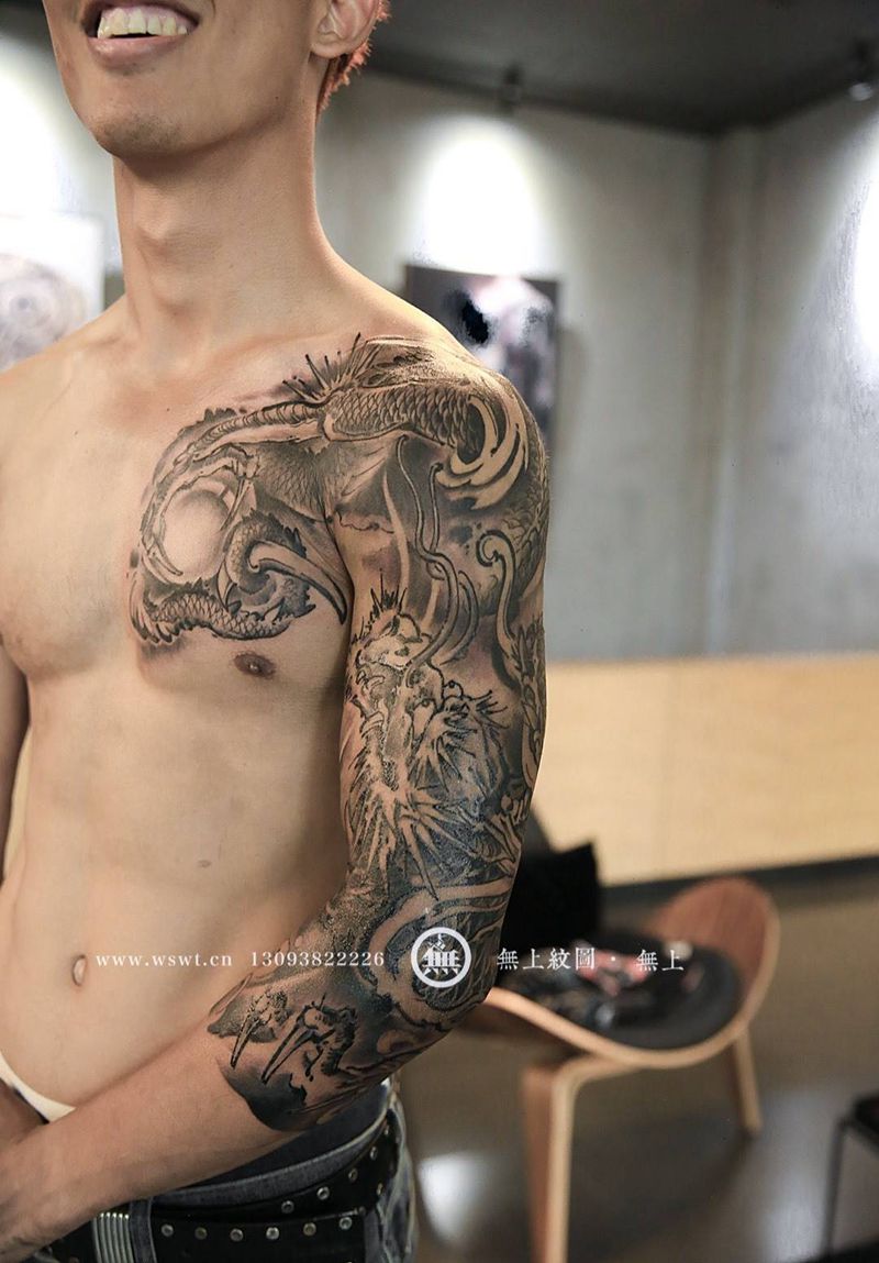 水墨龙纹身纹身图片_成品手臂胸部清新传统原创动物无上纹图水墨纹身图案