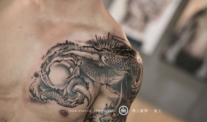 水墨龙纹身纹身图片_成品手臂胸部清新传统原创动物无上纹图水墨纹身图案