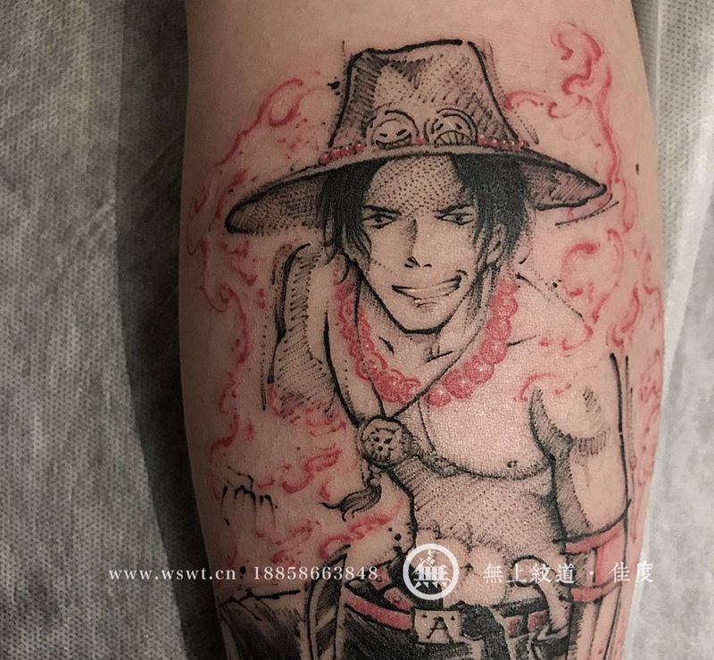 海贼王艾斯纹身图片_腿部人物遮盖纹身图案