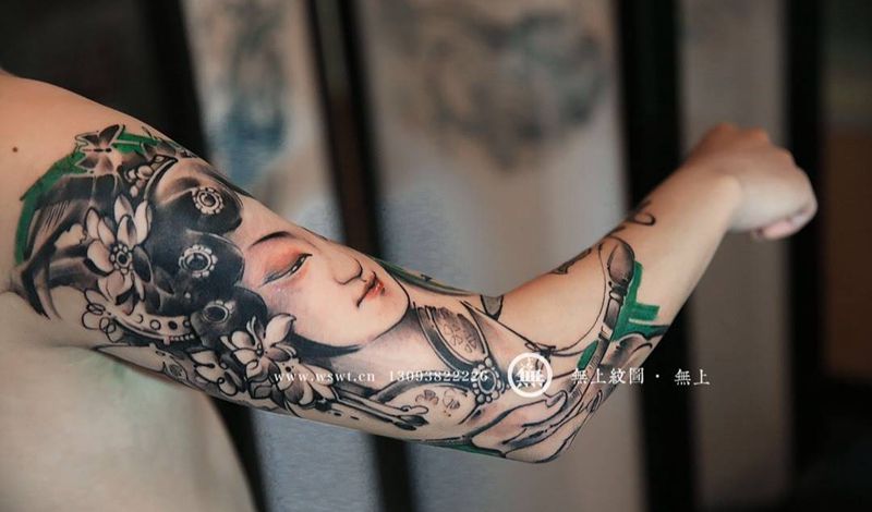 花旦花臂纹身图片_成品手臂传统清新原创人物肖像水墨无上纹图招生纹身图案
