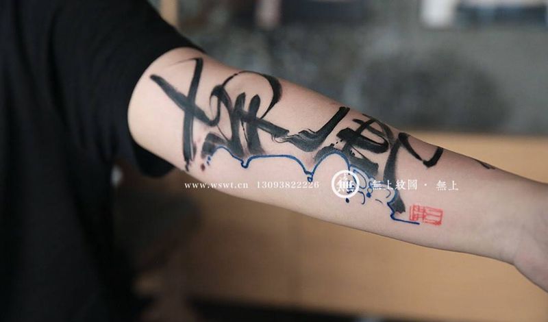 当前位置: 首页 >浙江省台州市纹身店-无上纹图纹身图案>书法花臂纹身图片_成品手臂传统清新字符原创无上纹图水墨书法纹身图案
