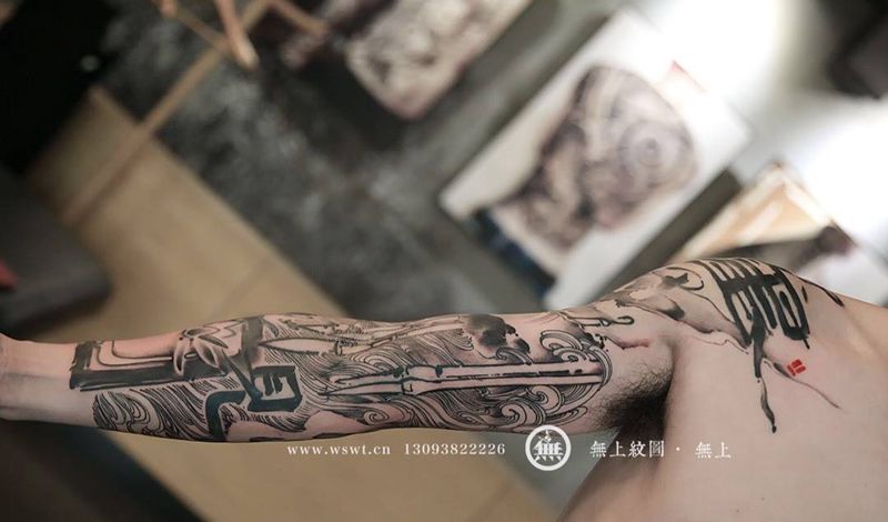 当前位置: 首页 >浙江省台州市纹身店-无上纹图纹身图案>无上水墨书法 —— 笔墨纸砚纹身纹身图片_手臂传统原创图腾无上纹图书法水墨纹身图案